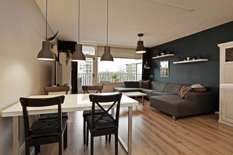 Door deze opstelling is vanuit de keuken direct contact met de woonkamer. De woonkamer is voorzien van een parketvloer en beschikt over een schuifpui naar de tuin.